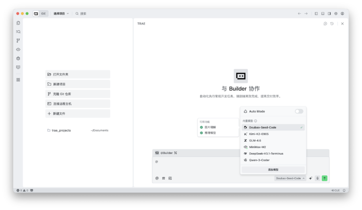 在 TRAE 中国版,还提供了 Kimi K2,GLM 4.6,以及 DeepSeek、Qwen 等常见国产编程模型。