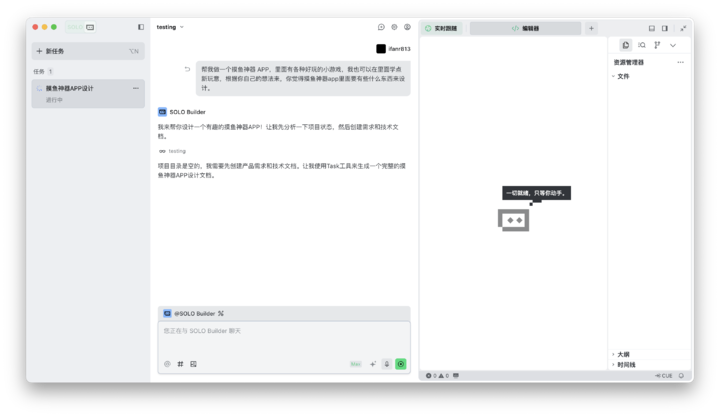 但不同的是,SOLO Builder 能凭借 TRAE 自身强大的开发环境,真正做出一个大规模可用的产品,不会停留在做一个小玩意路线上。