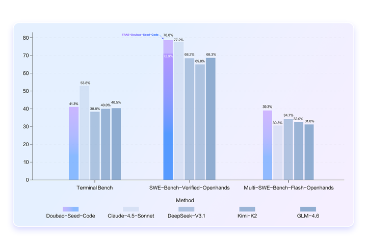 字节也专门为 Doubao-Seed-Code 在 TRAE 中的表现进行过优化,与 TRAE 深度结合的豆包编程模型,在对应的编程基准测试中,甚至拿到了超过 Claude 4.5 Sonnet 的成绩。