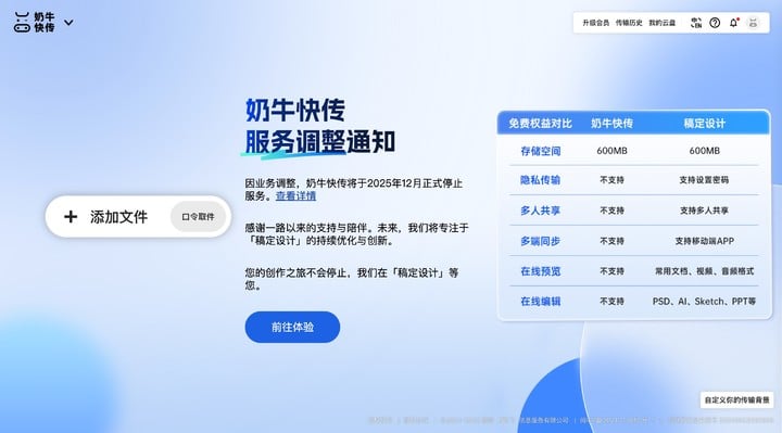 近日,在线文件传输平台「奶牛快传」(CowTransfer)宣布将于 2025 年 12 月 8 日起全面停止运营。届时登录、上传、下载等功能将同步关闭。官方提醒用户务必在关停前完成数据备份,否则文件将无法恢复。