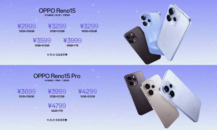 售价方面,Reno15 起售价 2999 元,提供 12GB + 256GB 至 16GB + 1TB 多种版本;Reno15 Pro 起售价 3699 元,最高可选 16GB + 1TB,售价 4799 元。