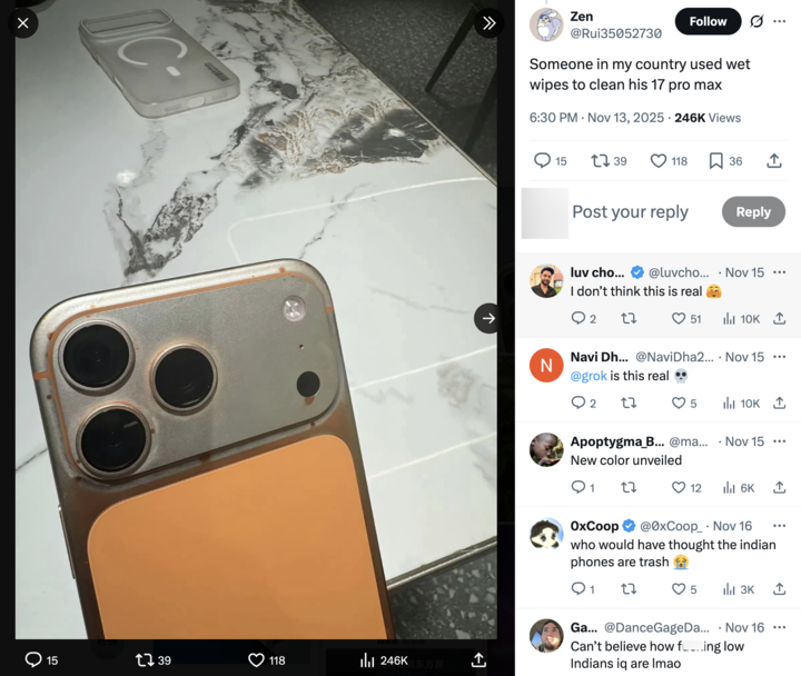 据了解,该问题首次被披露是在 11 月 15 日,博主 Zen(@Rui35052730)在 X 上发表贴文并配图称其 iPhone 17 Pro Max 在使用「湿巾」擦拭后掉漆,露出大面积铝金属原色。