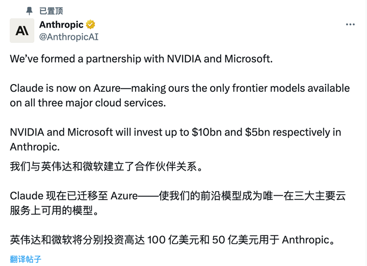 Anthropic 表示,Claude 现已迁移至 Azure 托管。Anthropic 将在本次计划中承诺购买 300 亿算力。