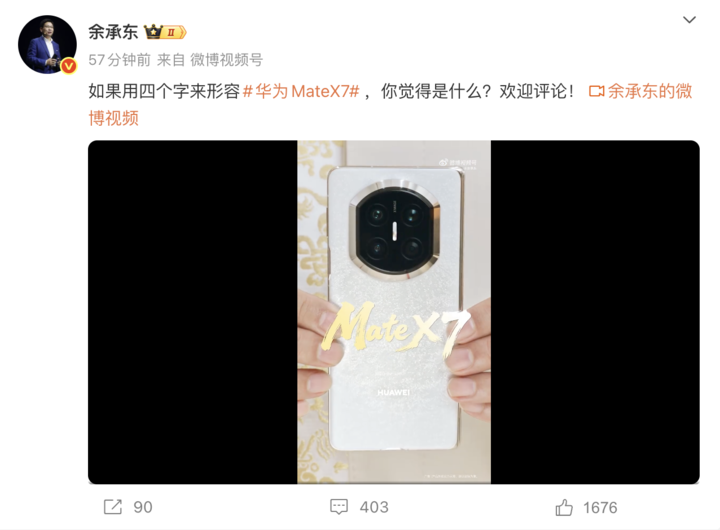 昨天,余承东发布视频,展示华为新款折叠屏手机 Mate X7 外观,并邀请网友用四个字形容这款产品。