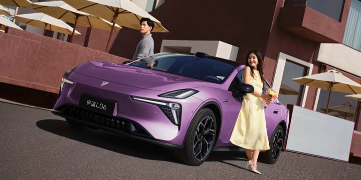 深蓝 L06 采用了家族的最新设计语言,前脸造型较为简洁,视觉重点则通过两条隆起的筋线被引导至了由 3 组 LED 大灯构成的「花瓣式」大灯组上。
