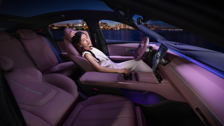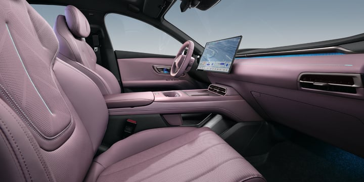 走进车内,新车座舱为经典的 T 字形布局,提供烟晶雾灰、月光石白、舒俱来紫三种配色,副驾配备了零重力座椅,支持 8 点式按摩,并搭载了 18 扬声器音响、256 色氛围灯等配置。