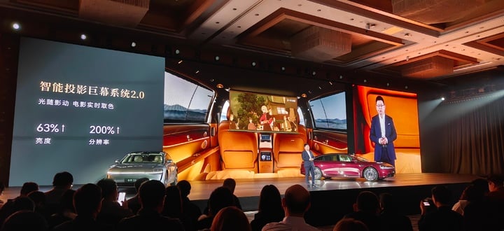后排延续了投影幕布的设定,只不过升级为智能投影巨幕系统 2.0,在分辨率和亮度上都有提升,更重要的是——全系标配。