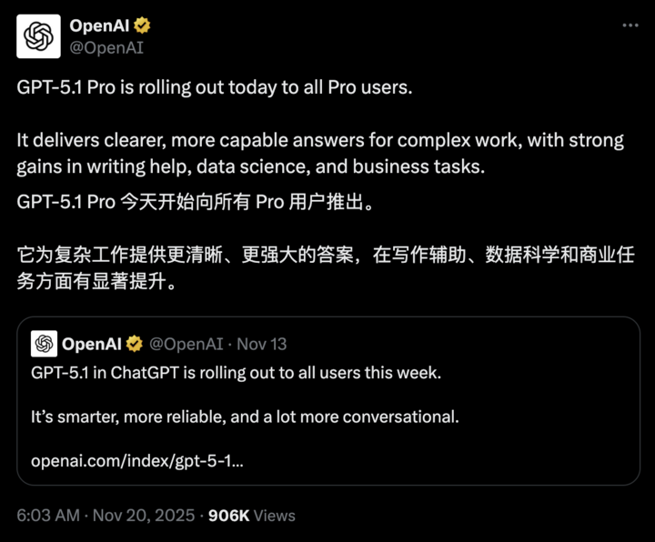 昨天,OpenAI 在 X 发帖,仅以两句话官宣正式推出 GPT-5.1 Pro,新模型在性能与应用场景上均实现突破,被视为对 Google Gemini 3 的直接回应。