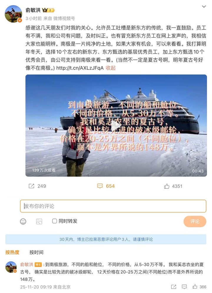 此前,俞敏洪在南极考察期间向员工发布内部信,引发部分员工「无法共情」的吐槽,相关话题登上微博热搜。随后,他在社交平台连续发布 10 条南极相关视频,包括冰川、动物与船舶画面,进一步引发讨论。