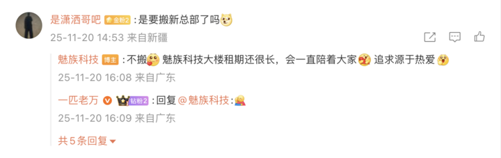 对此,有网友询问魅族科技官微:要搬新总部吗?魅族方面则回复称:「魅族科技大楼租期还很长,会一直陪着大家,追求源于热爱。」