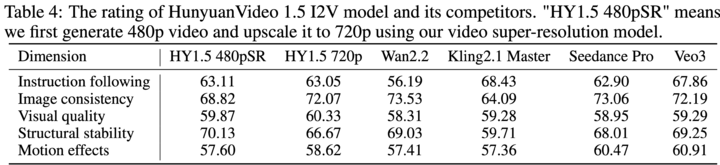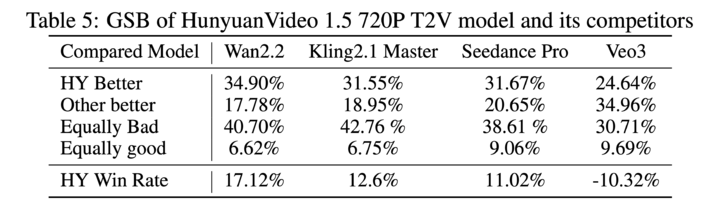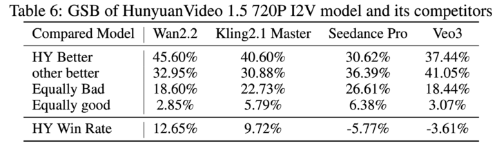 ▲ HunyuanVideo 1.5 和阿里 Wan2.2、快手 Kling2.1、字节 Seedance Pro 以及 Google Veo 3 对比,从文生视频到图生视频,HunyuanVideo 1.5 的表现在多个榜单仅次于 Veo3 之后。
