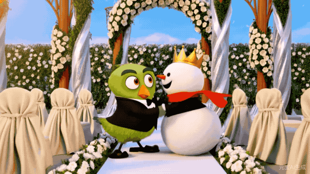 或者玩一些老梗,「生成视频,多邻国的吉祥物和蜜雪冰城的雪王一起步入婚姻殿堂。」