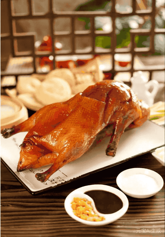 上传一张北京烤鸭的图片,然后输入「生成一段缓慢旋转拍摄,展示北京烤鸭的视频」,妥妥的产品展示。