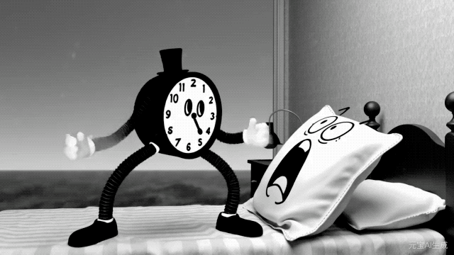 ▲ 提示词:生成视频,1930 年代黑白橡胶管动画风格(Rubber Hose Animation),一个长着手脚的闹钟正在疯狂殴打一个枕头,枕头在尖叫,画面有胶片噪点。