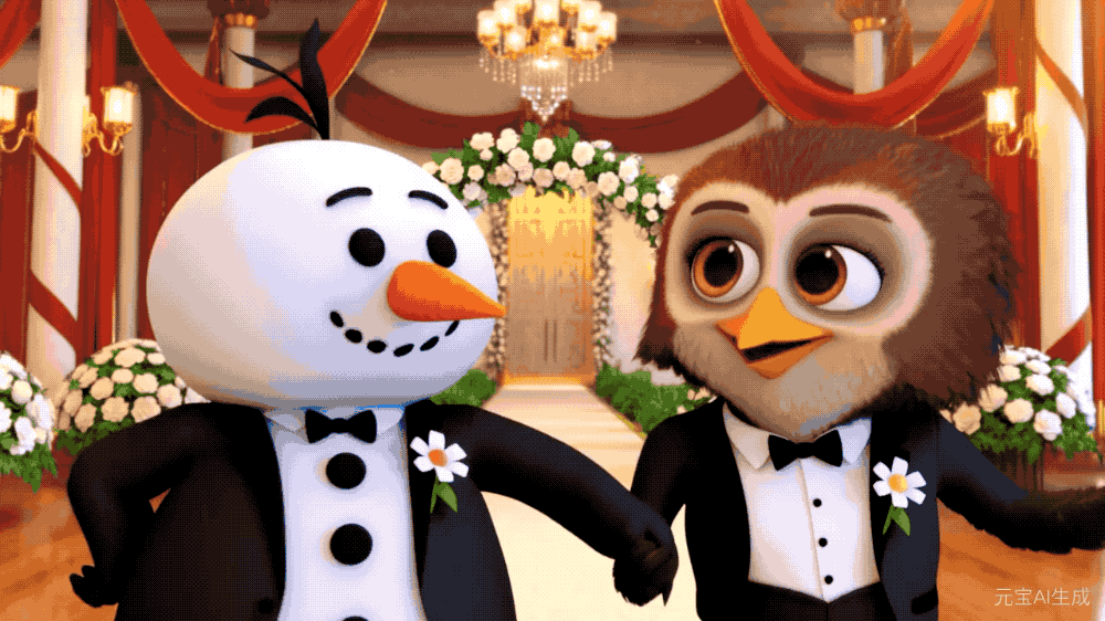 当我们把前面「倒着」走进婚姻殿堂的雪王和多儿,增加一些提示词的控制,告诉元宝从远景慢慢拉到近景,就不会再出现明显的 Bug 了。