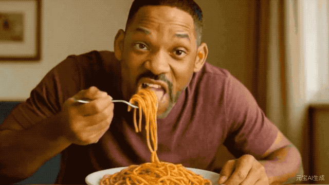 还有经典的威尔.史密斯吃面环节,有点黑猫警长的感觉了,这「眼睛瞪得像铜铃」。不过图生视频对比文生视频,AI 的恐怖谷效应和不真实感,确实减少了很多。