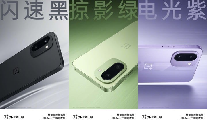 李杰表示,一加 Ace 6T 将带来「闪速黑」「掠影绿」「电光紫」三个配色,且全部采用低饱和度的哑光设计。配图显示,一加 Ace 6T 的矩形镜头模组位于机身左上角,采用一加家族设计语言。