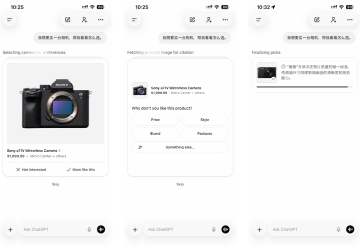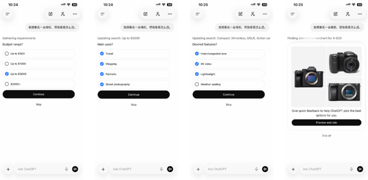 ▲我向他提问买相机,它首先问我的预算、接着是买相机的目的、还有一些期待的功能;如果不选择,大概在 15s 之后,ChatGPT 会自动跳过这些问题