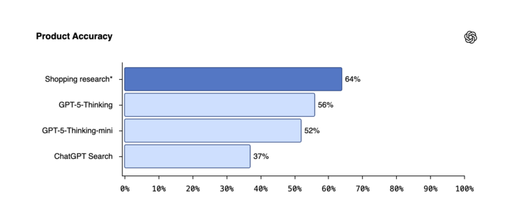 其次,这次购物研究的功能,是由一个经过强化学习训练的 GPT-5 mini 版本支持,专门用于购物任务。他们创建了一个新的评估方法,来衡量模型推荐的商品是否符合用户的需求,最后的结果是购物研究达到了最高的 64% 准确率。