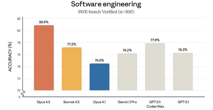 ▲ 最新发布的 Claude 4.5 Opus 模型,在编程相关的榜单,已经拿到了 80.9 分