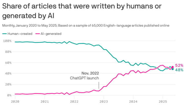 但现在,瓶颈来了。数据不够了,预训练数据,我们的互联网文本语料是有限的,而且已经快被用光了;有专门的研究结构统计过,现在互联网上 AI 内容的比例,已经是超过我们人类输出的内容。