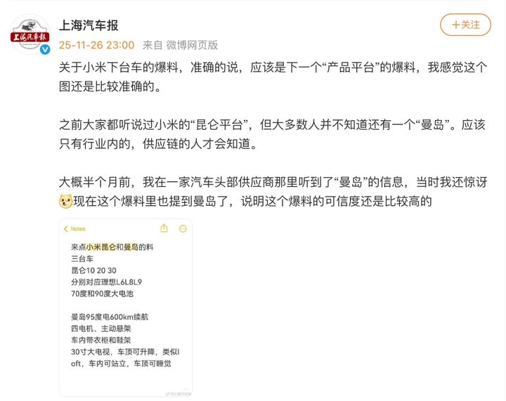 乍一看似乎真实性存疑,但随后微博有一位认证名称 @ 上海汽车报的博主转发了此消息,并称:「大概半个月前,我在一家汽车头部供应商那里听到了「曼岛」的信息,当时我还惊讶。现在这个爆料里也提到曼岛了,说明这个爆料的可信度还是比较高的。」