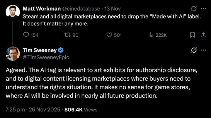 Sweeney 强调,AI 标签在艺术展览或数字内容市场中有意义,因为它能帮助明确作者身份和版权归属,但在游戏商店中并不必要。他认为未来几乎所有的游戏制作都会涉及 AI,因此强制披露失去了实际意义。