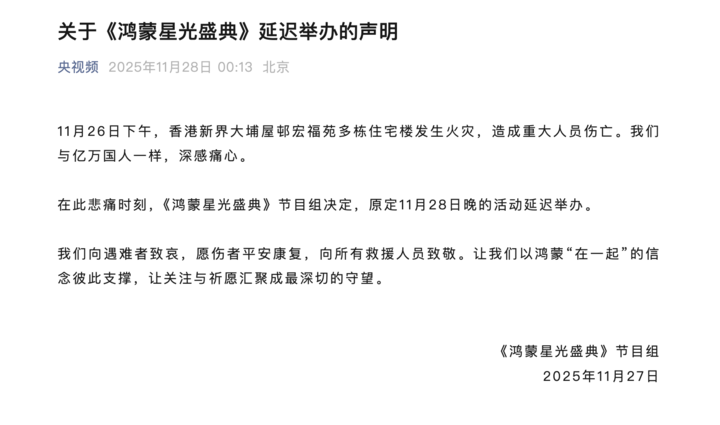 央视《鸿蒙星光盛典》宣布延期