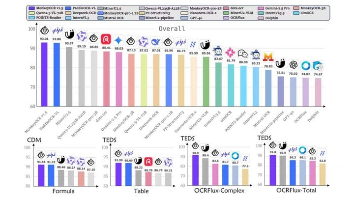 ▲ MonkeyOCR v1.5 模型的多模态文档解析性能对比