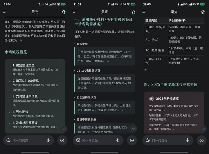 类似的体验还有很多:比如用「开眼」(视觉)功能看体检报告时,灵光会先给出摘要卡片,再用文字展开,最后总结和提醒;又比如准备出国需要的材料,一旦它理解了你的意图,便会主动生成一个可以照单勾选的 checklist。