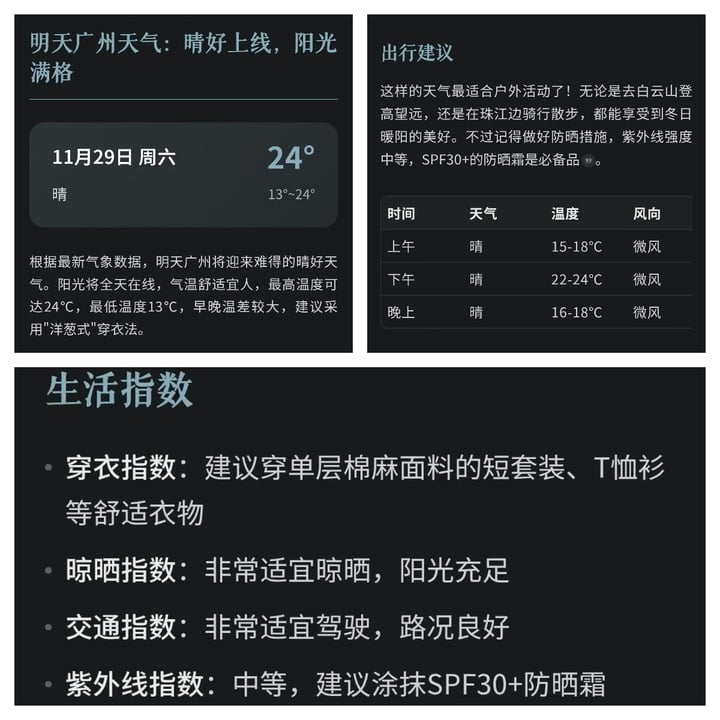 身边的老人用灵光查看广州天气,得到的不会只是天气数据的罗列,而有可能是一个气温变化图、一份穿衣建议、一份秋日出行指南——不仅易读,而且有用。