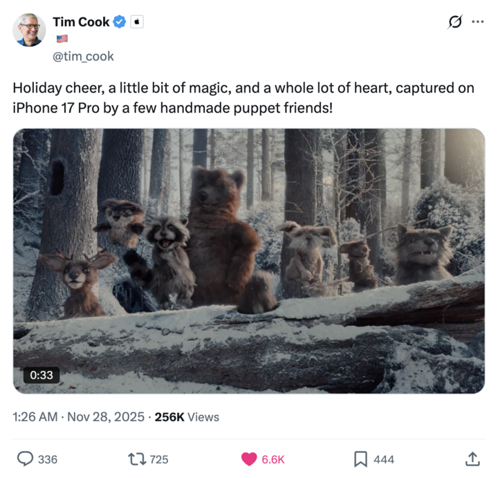 库克在推文中表示:「节日的欢乐气氛,一点点魔法,以及满满的温情,都被几个手工制作的木偶朋友用 iPhone 17 Pro 记录了下来」。