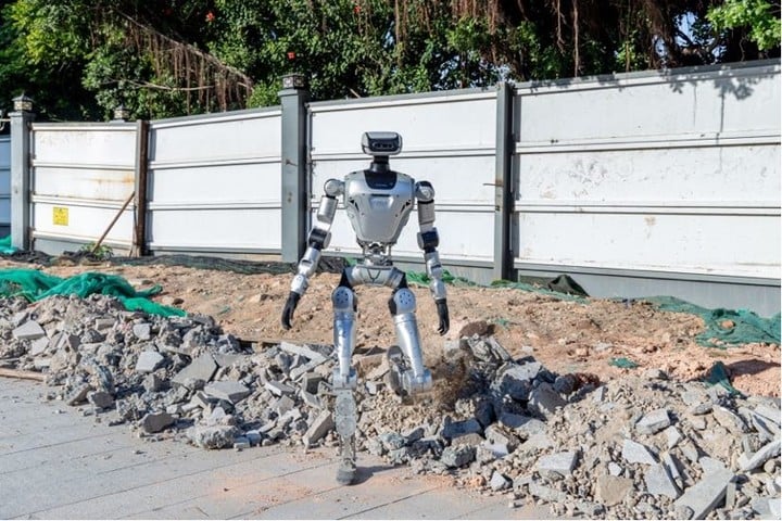 视频中,Oli 在沙土、石块、木板及建筑废料堆等多种非结构地形中保持稳定步态,展现出高度拟人的移动能力与抗扰动性能。
