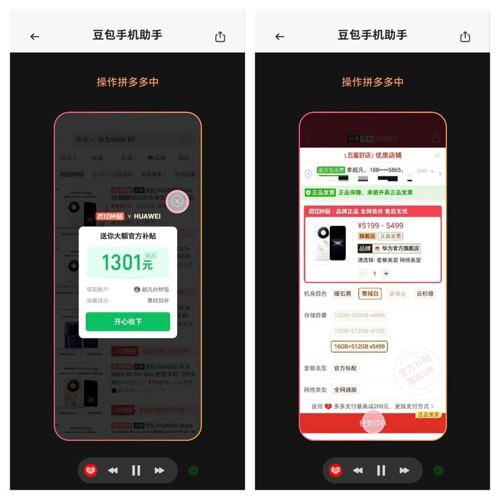像这种难度,豆包手机助手会调用「复杂任务」模式来进行手机操作。结果豆包一轮比价操作后,最后选了拼多多百亿补贴后的价格,并帮我加入购物车。