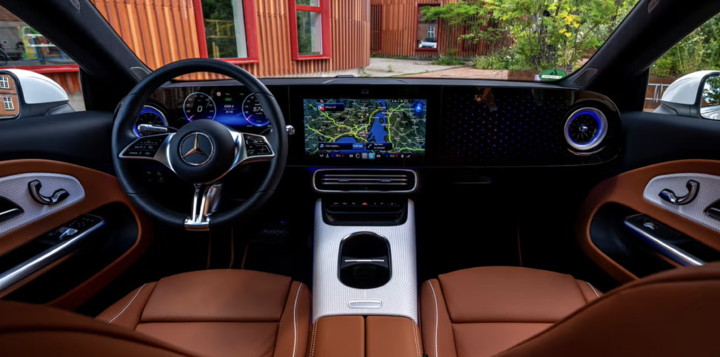 座舱设计上,CLA 毫无疑问地搭载了奔驰最新的数字化内饰语言。三块屏幕横向贯穿整个仪表台。
