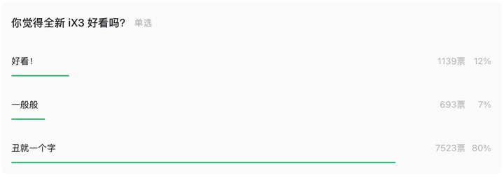 但是在董车会之前发布的投票中,有近 80% 的读者认为 iX3 的设计只能用「丑」来形容。