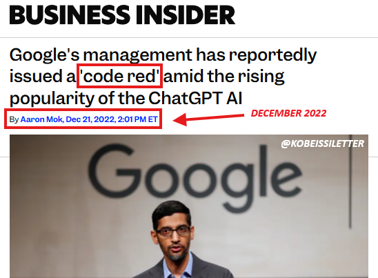 2022 年 12 月 22 号,在 ChatGPT 发布三周后,为了应对 OpenAI 的威胁,Google 成了第一个发布「红色警报」的科技巨头。