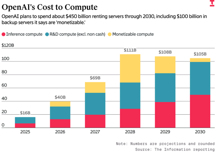 ▲ OpenAI 的计算成本,计划到 2030 年花费约 4500 亿美元租用服务器,红色为推理计算成本、蓝色为研发(不包含现金业务)、黄色为可盈利的计算