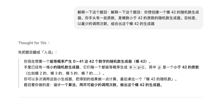 提到榜单的时候,他说他有自己的一套私房题,用来测试模型是不是真的具备了顶级数学直觉。他举了一个 42 的数学难题,说目前的语言模型,包括 o1 这种思考模型能接近最优解,但从来没有完全破解它。