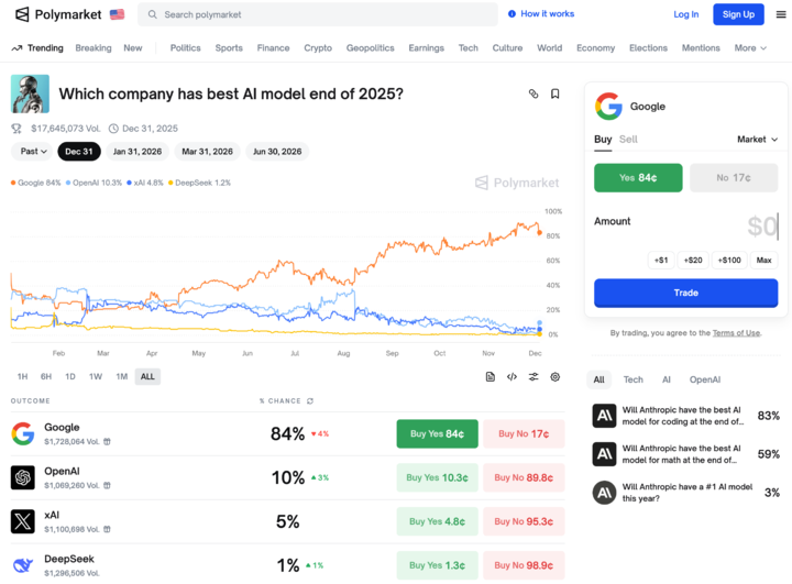 ▲ 预测市场给出的,到 2025 年底前最好的 AI 模型会来自哪个公司,Google 排在第一名