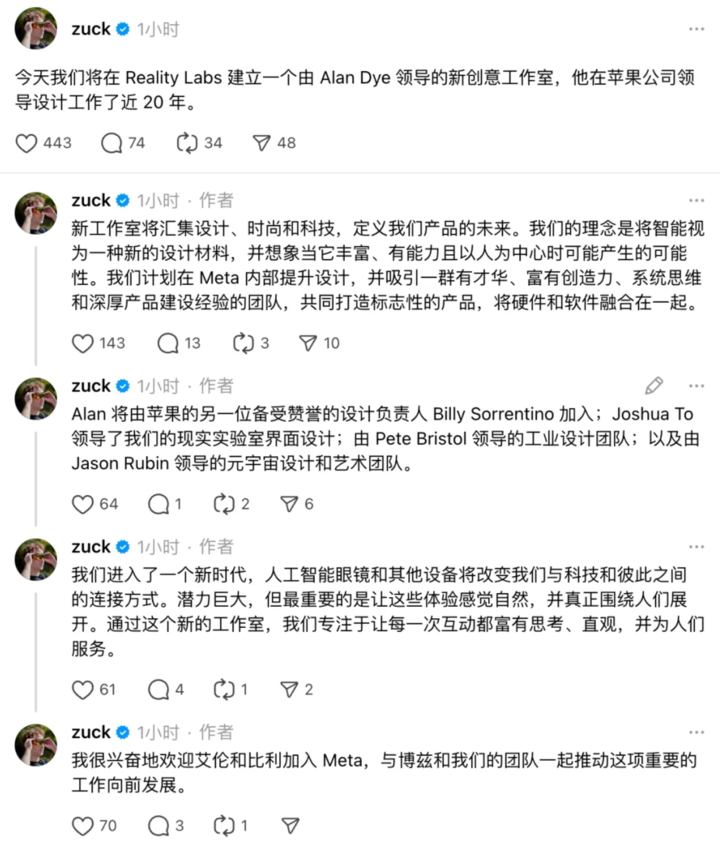 但问题是,对比讲究精雕细琢、追求极致的苹果,Meta 的产品能用,但总是差点意思,所以这次挖来 Dye,扎克伯格显然是想弥补这块短板。