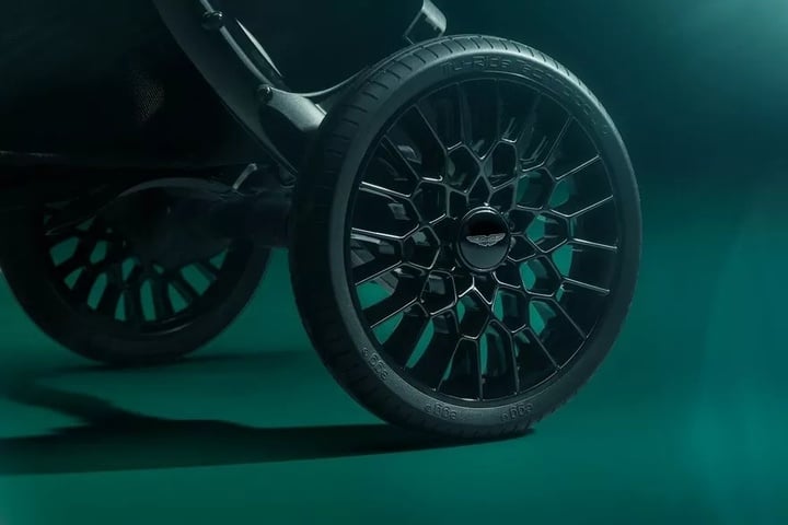 这款推车从阿斯顿·马丁价值百万美元的 Valour 与 Victor 超级跑车中汲取灵感,采用蜂窝状辐条轮毂设计;车架饰以精致绗缝细节,试图在触感层面复刻其奢华座舱的体验。