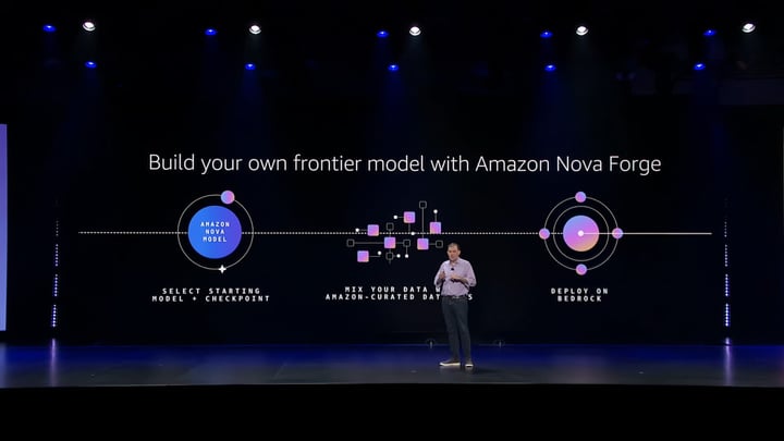 • 模型定制化革命:推出 Amazon Nova Forge,首创「开放式训练模型」理念,允许企业将自有数据融入基础模型的预训练阶段,创造深度定制的专属模型。