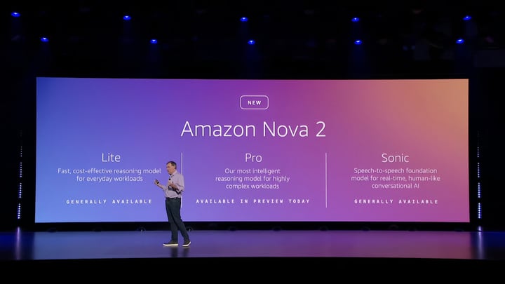 • 自研模型家族全面升级:发布 Amazon Nova 2 模型家族,包含 Lite、Pro、Sonic(语音)、Omni(多模态)四个核心模型,覆盖从轻量到复杂的全场景需求。