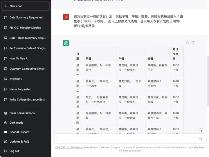 我翻了翻我向 ChatGPT 提的第一个任务是什么:不出所料,果然是文字工作,写一个英语文书。后面还有随大流,让它帮我做一个减肥食谱。当年标志性的黑绿配色,真是唤醒人的记忆。