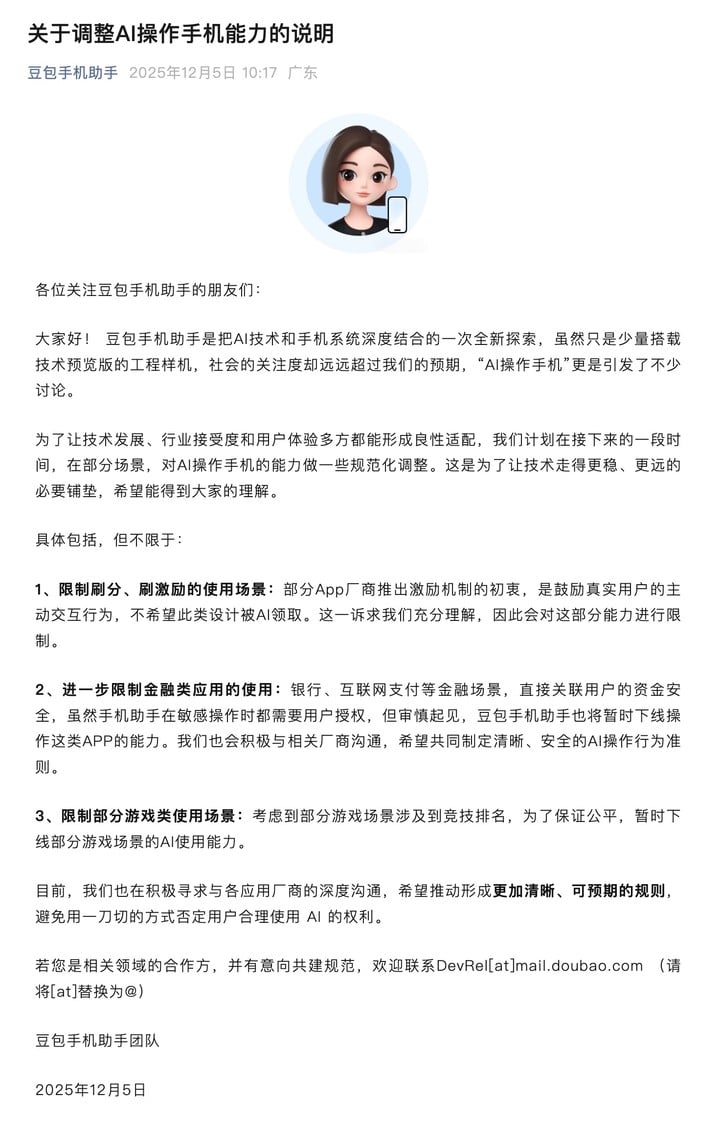 昨天,豆包官方宣布将对豆包手机助手「AI 操作手机」能力进行规范化调整,以应对行业安全与用户体验的双重挑战。