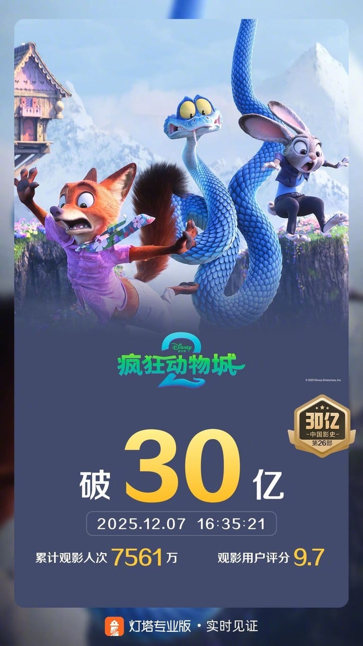据灯塔专业版,截至 12 月 7 日,《疯狂动物城 2》总票房(含预售)已突破 30 亿,进入 2025 年票房榜前三名。