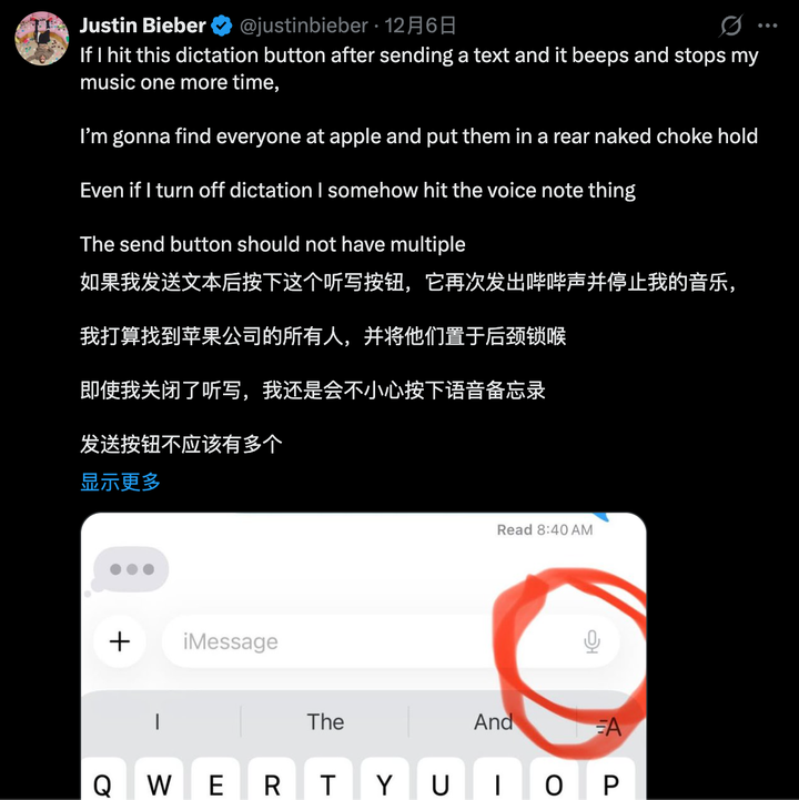 比伯指出,iPhone 的 iMessage 中的语音输入按钮设计不合理,不仅会因为摆放位置容易误触,并且还会造成正在播放的音乐被强制中断。比伯表示,其打算找到苹果的所有人,并且对他们使出后颈锁喉技能。
