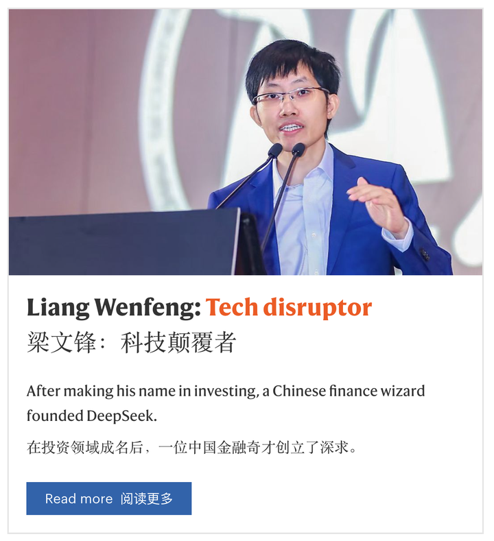 - DeepSeek 创始人梁文锋入选,《自然》对其评语是「在投资领域崭露头角之后,一位中国金融奇才创立了 DeepSeek。」