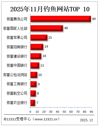 日前,中国互联网协会原因 12321 网络不良与垃圾信息举报受理中心数据,据 12321 接到网民投诉的短信、邮件、网站等信息,2025 年 11 月被投诉的钓鱼网站前十名如下: